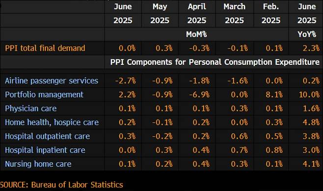 6월 PPI(최종 수요)는 전월 대비 보합(0%)에 머물렀습니다. 월가 예상(+0.2%)을 밑돌았습니다. 전년 동기 대비로도 2.3%(예상 2.5%) 오르는 데 그쳤고요. 이는 5월 2.7%보다 둔화한 것이고, 2024년 9월 이후 최저치입니다.