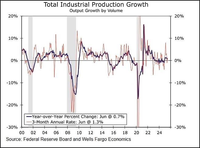 오늘 6월 산업생산은 0.3% 증가했는데요. 5월 수치도 0.2% 감소가 보합으로 상향 수정됐습니다. 웰스파고는 "제조업의 르네상스라고 하기에는 거리가 멀지만, 암울한 예상보다는 다소 긍정적인 데이터가 나왔다"라고 분석했습니다.