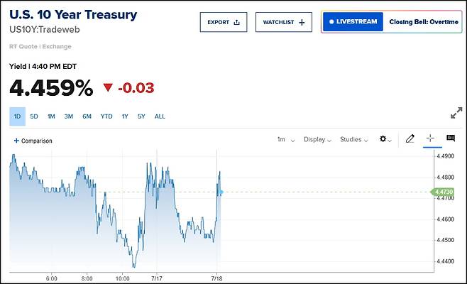 오후 4시 40분께 국채 10년물 수익률은 3bp 내린 4.459%, 2년물은 6.3bp 떨어진 3.896%를 기록했습니다. 30년물의 경우 0.7bp 내린 5.011%로 여전히 5% 대를 유지했습니다.