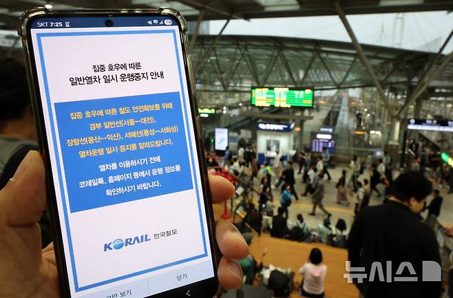 [서울=뉴시스] 이영환 기자 = 집중 호우에 따른 경부 일반선, 장항선, 서해선 열차운행이 일시 중지된 17일 오전 서울 용산구 서울역에서 실행시킨 코레일톡 어플에 안내문이 표시되고 있다. 2025.07.16. 20hwan@newsis.com