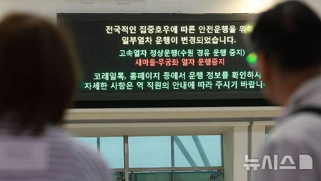 [서울=뉴시스] 이영환 기자 = 집중 호우에 따른 경부 일반선, 장항선, 서해선 열차운행이 일시 중지된 17일 오전 서울 용산구 서울역에 운행 중지 안내가 표시되고 있다. 2025.07.16. 20hwan@newsis.com
