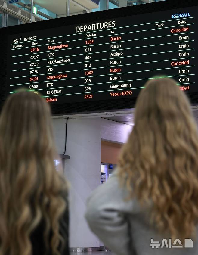 [서울=뉴시스] 이영환 기자 = 집중 호우에 따른 경부 일반선, 장항선, 서해선 열차운행이 일시 중지된 17일 오전 서울 용산구 서울역에 운행 중지 안내가 표시되고 있다. 2025.07.16. 20hwan@newsis.com
