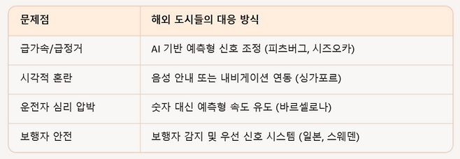 - 해결 : 싱가포르는 차량과 신호등이 직접 통신하는 V2I(Vehicle-to-Infrastructure) 기술을 활용해, 운전자에게 음성 또는 내비게이션 화면을 통해 부드럽게 안내해요.