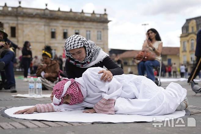 [보고타=AP/뉴시스] 16일(현지 시간) 콜롬비아 보고타에서 팔레스타인을 지지하는 시위대가 이스라엘의 가자지구 군사 행동에 항의하는 시위를 하면서 퍼포먼스를 펼치고 있다. 2025.07.17.