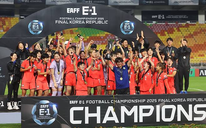 | ▲ 16일 수원월드컵경기장에서 열린 2025 동아시아축구연맹(EAFF) E-1 챔피언십(동아시안컵) 여자부 대한민국 대 대만 경기. 2 대 0으로 승리하며 우승한 대한민국 대표팀이 트로피를 들고 기뻐하고 있다. |