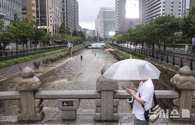[서울=뉴시스] 김근수 기자 = 서울지역에 강한 비가 내리는 가운데 17일 서울 종로구 청계천 모전교 인근에서 산책로가 통제되고 있다. 2025.07.17. ks@newsis.com