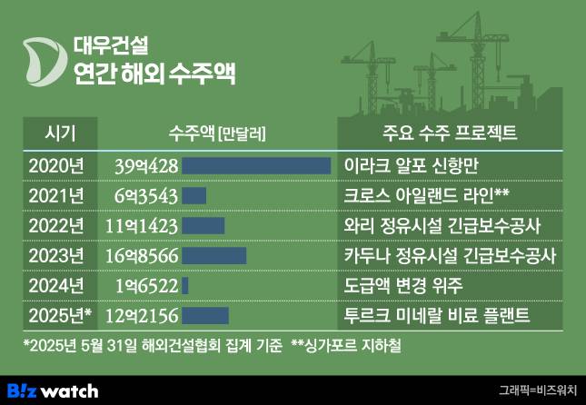 대우건설은 지난 2020년 이라크 알포 신항만 사업을 수주하며 39억428만달러를 쓸어담았다. 이후 부진이 깊었다. 2021년에는 코로나19 등 영향으로 6억3542만달러를 기록하며 11위에 그쳤다. 2022년과 2023년에는 각각 11억1422만달러, 16억8565만달러로 9·6위에 올랐다.