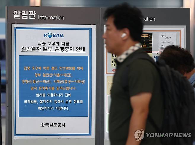 (서울=연합뉴스) 김성민 기자 = 호우주의보가 발령된 17일 서울 중구 서울역에 경부선, 장항선, 서해선 일부 일반열차 운행이 중지됐다는 안내문이 붙어 있다. 2025.7.17