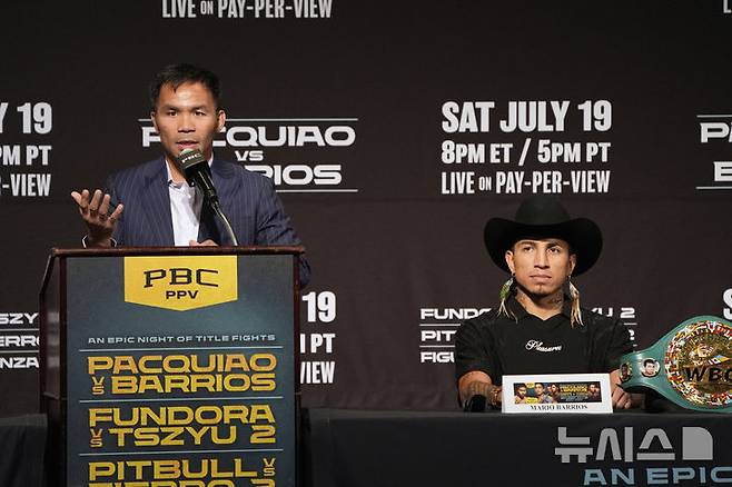 [라스베이거스=AP/뉴시스] 필리핀 복싱 영웅 매니 파키아오(46)가 16일(현지 시간) 미 네바다주 라스베이거스에서 기자회견하고 있다. 파키아오는 19일 라스베이거스에서 세계복싱평의회(WBC) 웰터급 챔피언 마리오 바리오스(30, 미국)를 상대로 복귀전을 치른다. 2025.07.16.