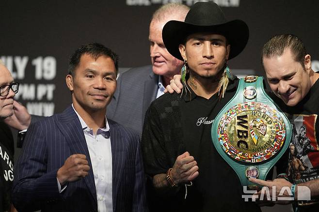 [라스베이거스=AP/뉴시스] 필리핀 복싱 영웅 매니 파키아오(46, 왼쪽)가 16일(현지 시간) 미 네바다주 라스베이거스에서 마리오 바리오스(30, 미국)와 타이틀전 기자회견을 하면서 포즈를 취하고 있다. 파키아오는 19일 라스베이거스에서 세계복싱평의회(WBC) 웰터급 챔피언인 바리오스를 상대로 복귀전을 치른다. 2025.07.16.