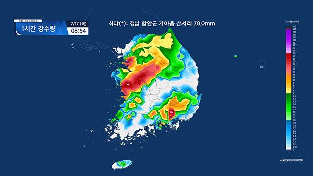 오늘(17일) 오전 8시 54분 현재, 경남 함안군 가야읍 산서리에 직전 1시간 동안 70.0mm의 매우 강한 비가 내렸습니다.