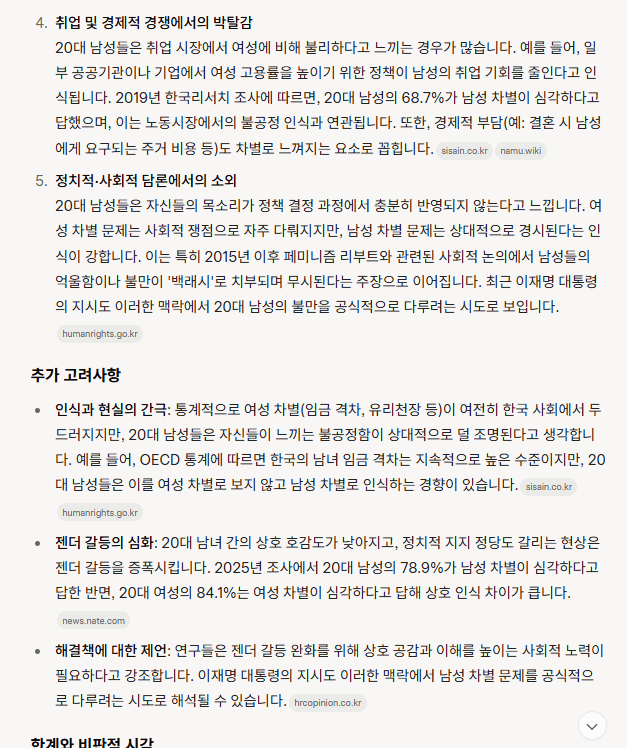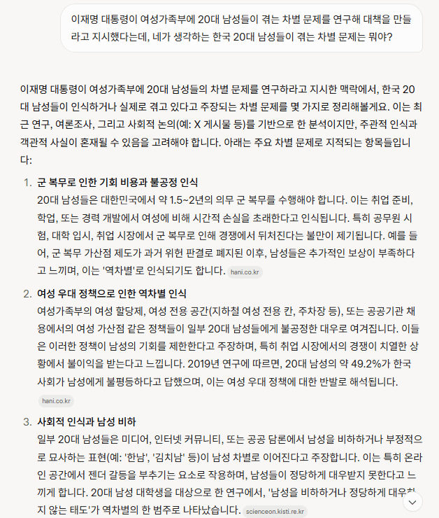 질문: 이재명 대통령이 여성가족부에 20대 남성들이 겪는 차별 문제를 연구해 대책을 만들라고 지시했다는데, 네가 생각하는 한국 20대 남성들이 겪는 차별 문제는 뭐야?