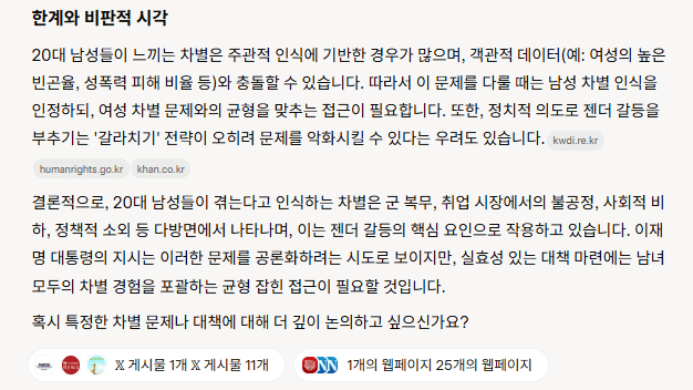 20대 남성들이 느끼는 차별은 주관적 인식에 기반한 경우가 많으며, 객관적 데이터(예: 여성의 높은 빈곤율, 성폭력 피해 비율 등)와 충돌할 수 있습니다. 따라서 이 문제를 다룰 때는 남성 차별 인식을 인정하되, 여성 차별 문제와의 균형을 맞추는 접근이 필요합니다. 또한, 정치적 의도로 젠더 갈등을 부추기는 '갈라치기' 전략이 오히려 문제를 악화시킬 수 있다는 우려도 있습니다.