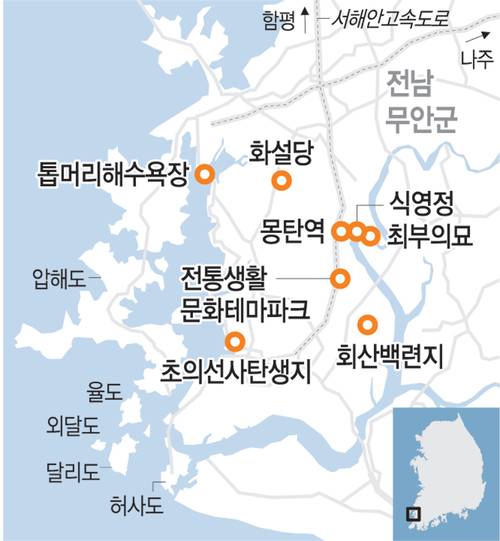 이번에는 무안의 고만고만한 명소를 모았다. 무안 청계면에는 정자 ‘화설당’이 있다. 화설(花雪)이란 이름은 400년 전쯤 나주 목사 박동열과 ‘간양록’을 지은 수은 강항이 함께 찾았다가 뜰에 핀 동백꽃이 눈에 덮인 걸 보고 붙인 이름. 정자에 건 현판은 우암 송시열이 칡나무 뿌리를 붓 삼아 쓴 것이다.