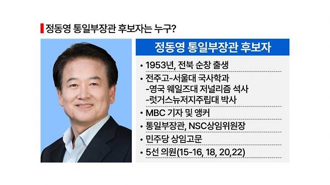 정 후보자는 1953년 전북 순창에서 태어났다. 전주고-서울대 국사학과를 나왔다. 영국 웨일스대에서 저널리즘 석사 학위를 받았다. 15대 때인 1996년 국회에 진입했다. 노무현 정부에서 열린우리당 당의장, 통일부 장관, NSC 상임위원장 등을 지냈다. 민주당 상임고문으로 5선 의원(전북 전주시병)이다.1974년 육군에 입대해 병장으로 군 복무를 마쳤다. 재산은 21억 9000만원 정도 된다.