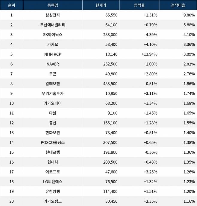 이어 두산에너빌리티(034020)가 검색비율 2위를 기록하며 0.79%의 상승세를 보이고 있다. 검색비율 3위의 SK하이닉스(000660)는 4.39% 하락하며 시작하고 있다. 검색비율 4위 카카오(035720)는 개장 초반부터 4.10% 상승하며 출발하고 있다. 검색비율 5위 NHN KCP(060250)는 13.94% 급등세를 보이고 있다.