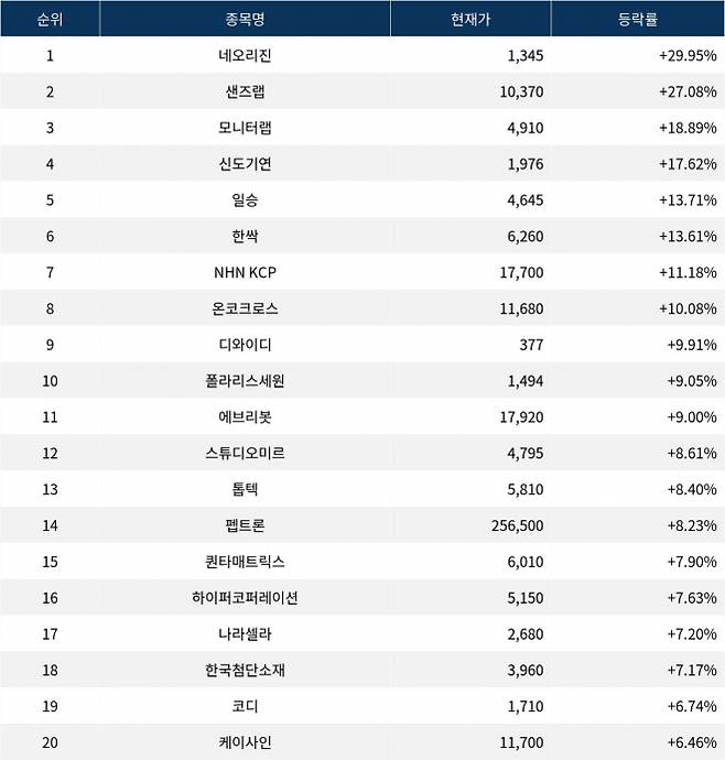 6위 한싹(430690)은 현재가 6,260원으로 13.61% 상승 중이다. 7위 NHN KCP(060250)는 현재가 17,700원으로 11.18% 상승 중이다. 8위 온코크로스(382150)는 현재가 11,680원으로 10.08% 상승 중이다. 9위 디와이디(219550)는 현재가 377원으로 9.91% 상승 중이다. 10위 폴라리스세원(234100)은 현재가 1,494원으로 9.05% 상승 중이다.