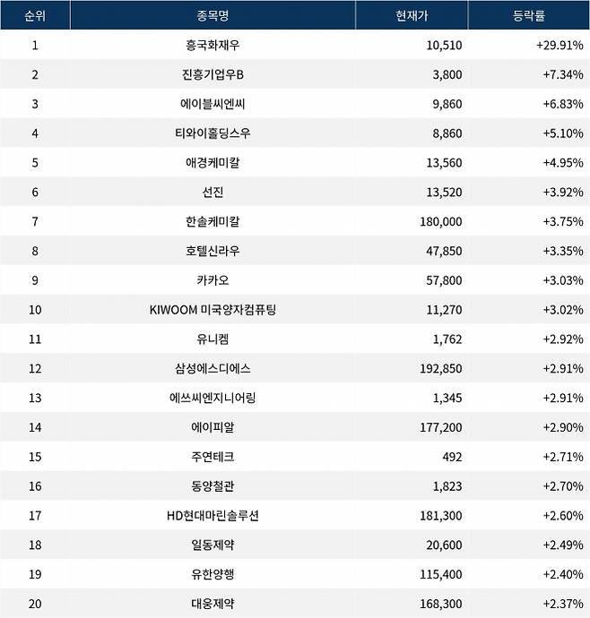 6위 선진(136490)은 현재가 13,520원으로 3.92% 상승 중이다. 7위 한솔케미칼(014680)은 현재가 180,000원으로 3.75% 상승 중이다. 8위 호텔신라우(008775)는 현재가 47,850원으로 3.35% 상승 중이다. 9위 카카오(035720)는 현재가 57,800원으로 3.03% 상승 중이다. 10위 KIWOOM 미국양자컴퓨팅(498270)은 현재가 11,270원으로 3.02% 상승 중이다.