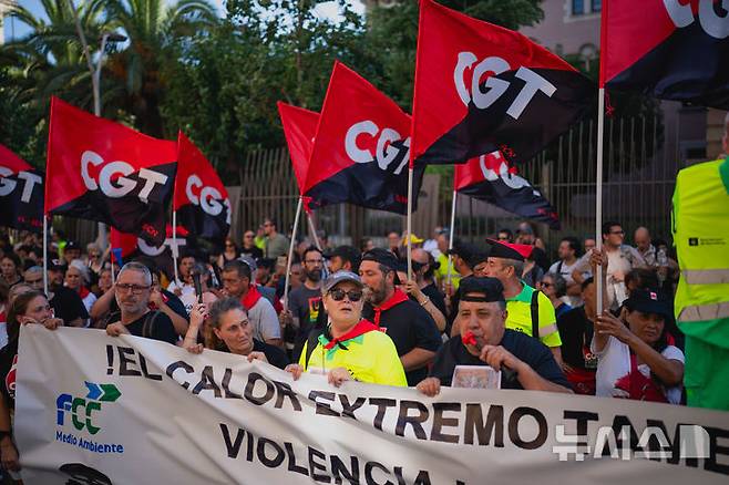 16일(현지 시간) 스페인 바르셀로나에서 환경 미화원들과 시위대가 지난달 말 폭염 속 근무하던 환경 미화원의 사망에 항의하며 행진하고 있다.