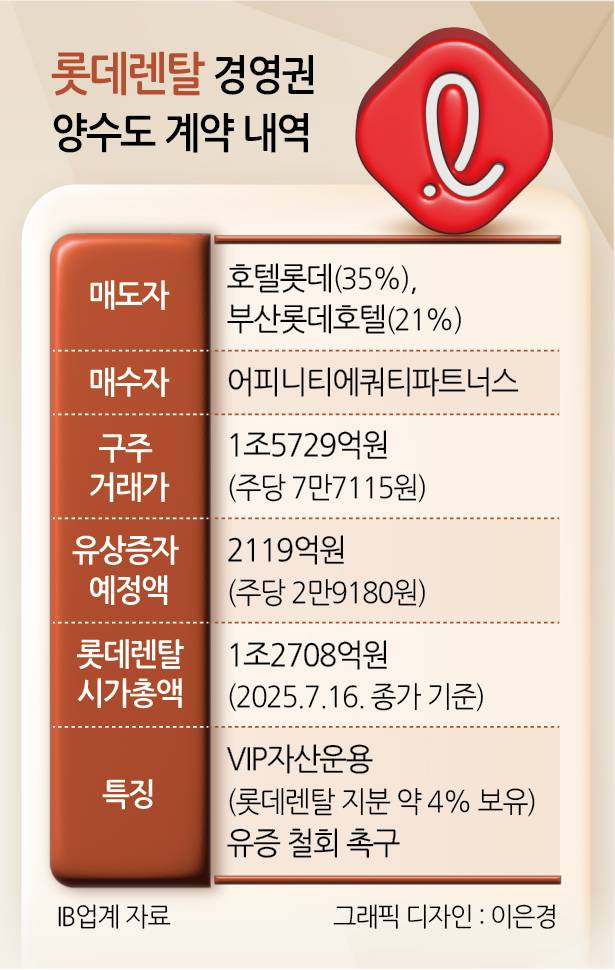 올 3월 롯데렌탈 최대주주 호텔롯데와 부산롯데호텔은 경영권 지분 56.2%를 어피니티에 매각하기로 결정했다.