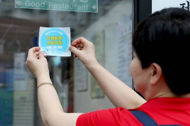 사진은 지난 16일 서울 성동구의 한 음식점에 소비쿠폰 사용 가능 안내 스티커를 부착하는 모습.