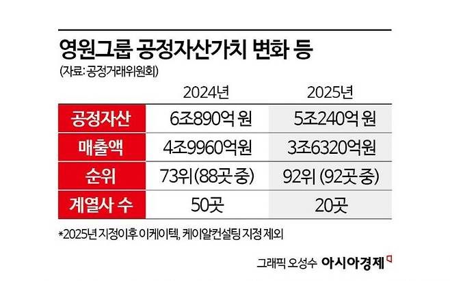 영원무역그룹은 내년 대기업집단 지정을 피할 것으로 보인다. 올해 두 번째 보고서를 낸 영원그룹의 공정 자산 총액은 5조240억원이다. 지난해 총액인 6조890억원보다 약 1조600억원가량이 감소했다. 화신, 화신정공 등 32개 사가 친족 독립경영 인정을 받으면서 계열회사가 50개에서 20개로 줄었기 때문이다. 화신은 성기학 회장의 외삼촌인 고(故) 정호 창업주가 일궈낸 자동차 부품 기업으로 자동차 섀시와 차체 부품을 전문적으로 생산하고 있다. 계열회사가 20개로 줄면서 영원그룹의 전체 순위도 내려갔다. 영원은 2025년 공시대상기업집단으로 선정된 92개 사 중 가장 마지막인 92위를 기록했다.