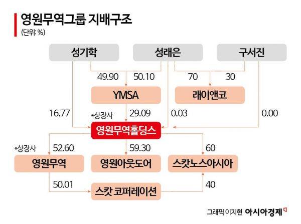 업계에서는 성래은 부회장의 딸 구서진가 비상장사인 래이엔코 지분을 통해 승계의 발판을 마련할 것으로 보고있다. 래이앤코와 YMSA를 합병하는 방식으로 영원무역그룹 지배구조에 편입하는 방식이다. 내부거래를 통해 비상장사를 키우고 배당금으로 증여세 재원을 마련할 수 도 있다. 다만 래이앤코의 지난해 기준 매출액은 20억원, 영업이익은 2억원에 그친다.