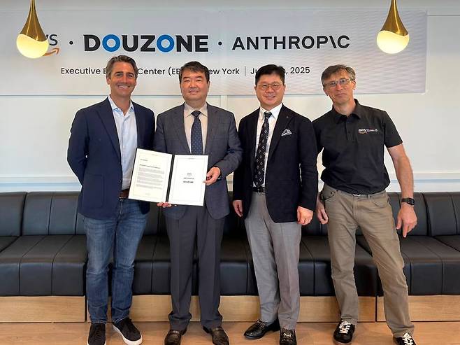 더존비즈온이 16일 현지시간 글로벌 클라우드 기업 '아마존웹서비스(Amazon Web Services, 이하 AWS)'와 인공지능(AI) 시장을 선도하는 AI 스타트업 '앤트로픽(Anthropic)'과 함께 업무협약을 체결했다고 밝혔습니다.