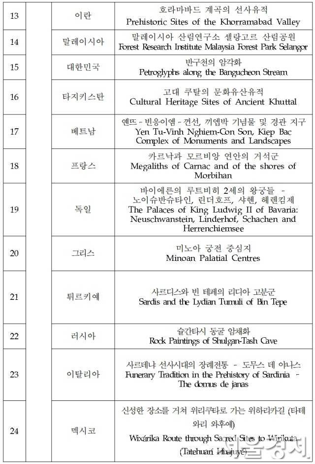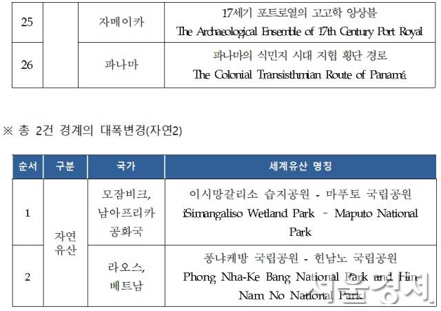 신규 등재 외에 기존 등재 유산인 모잠비크·남아프리카공화국의 ‘이시망갈리소 습지공원-마푸토 국립공원’과 라오스·베트남의‘퐁냐케방 국립공원-힌남노 국립공원’의 유산 경계 변경이 승인됐다.
