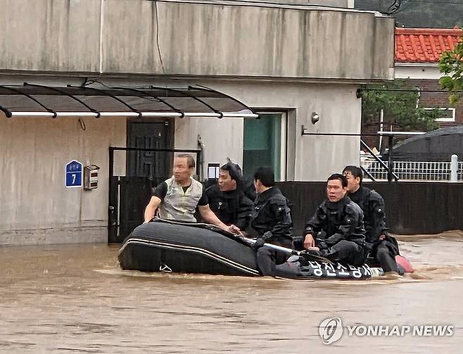 (당진=연합뉴스) 17일 오전 충남 당진시 용연동에서 소방대원들이 주민을 구조하고 있다. 2025.7.17. [충남소방본부 제공. 재판매 및 DB 금지]