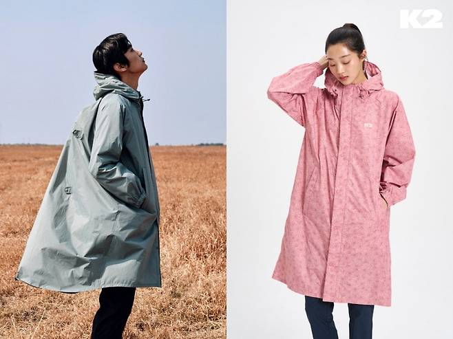 아웃도어 브랜드 K2의 레인코트도 인기다. 내구성이 좋은 경량 나일론 소재를 사용한 제품이다. 얇고 가볍다보니 쓰지 않을 때는 가방에 넣고 다닐 수가 있다. 백팩 등 짐까지 덮을 수 있도록 확장이 가능해 직장인들의 출퇴근 장마템으로도 이용되고 있다. 여성용 ‘슬림 레인코트’의 경우 날렵한 슬림핏으로 스타일을 강조했다.