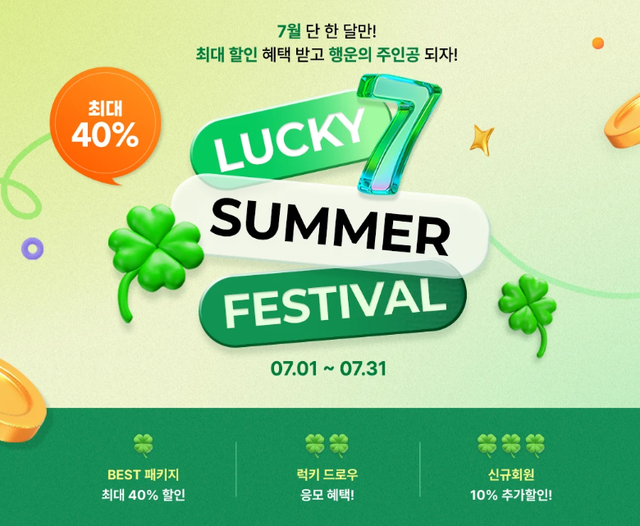 한편 시원스쿨은 ‘럭키 7 썸머 페스티벌 프로모션’을 통해 주요 베스트 패키지 상품 최대 40% 할인, 경품 응모 혜택, 신규 회원 추가 할인 등 다양한 혜택을 제공하며, 여름 기간 동안 영어 공부를 목표로 하는 수강생들에게 최적의 기회를 제공하고 있다.