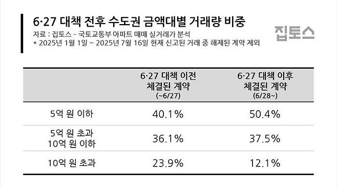 ▲ 6·27 대책 전후 수도권 금액대별 거래량 비중