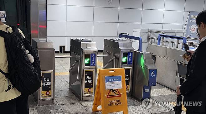 (과천=연합뉴스) 나확진 기자 = 17일 경기 과천시 지하철 4호선 선바위역 개찰구에 '폭우로 인한 상행선 운행 중단' 안내문이 붙어 시민들이 난감해하고 있다. 2025.7.17