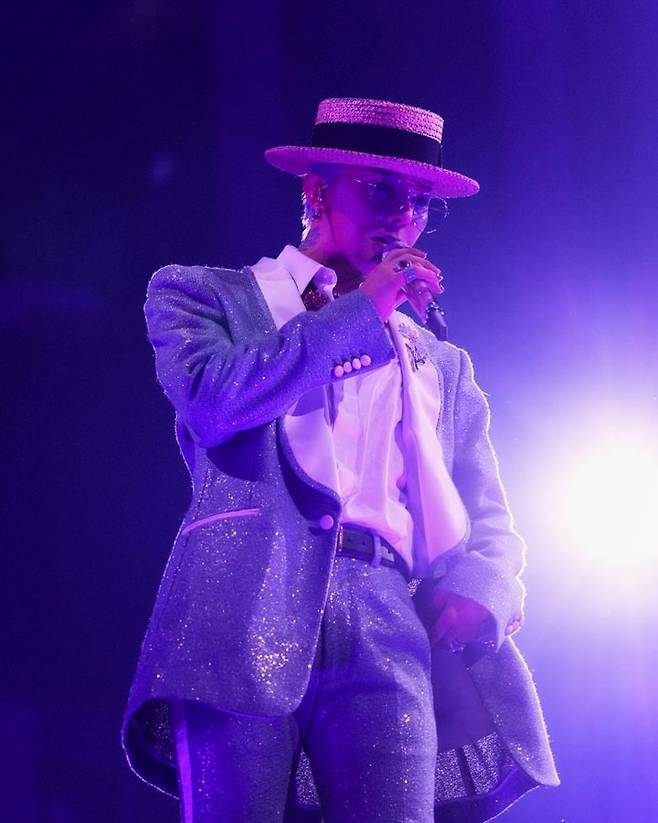 지드래곤은 무대 위에서도 패션으로 관객을 사로잡는다. 특히, 화려한 글리터가 가득한 수트와 페도라는 그의 개성과 무대에서의 독보적인 존재감을 잘 보여준다.