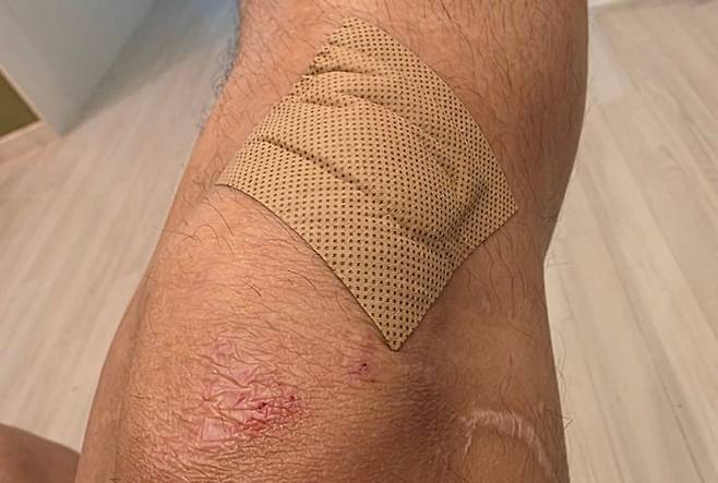 사진에는 무릎 위에 밴드를 붙인 오지헌의 모습이 담겼다. 무릎 외에도 곳곳에 남아있는 선명한 상처가 사고의 아찔함을 짐작하게 한다.