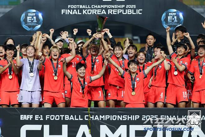 20년 만의 우승 세리머니, 20년 전인 2005년 북한, 중국을 꺾고 일본과 비기며 동아시안컵 초대 챔피언에 올랐던 '선배' 유영실 서울시청 감독, 송주희 경주한수원 감독과 이미연 대한축구협회 이사(문경 상무 감독), 안태화 창녕WFC 감독과 함께 시상대에 올라 후배, 제자들의 쾌거를 기뻐하는 장면은 뭉클했다. 한국 여자축구의 과거, 현재, 미래가 우승 역사로 하나 된, 가슴 뜨거운 순간이었다.