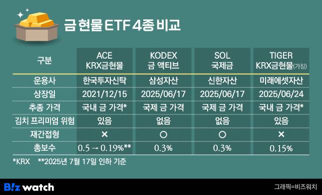 국제 금 가격을 추종하는 KODEX 금액티브와 SOL 국제금의 총보수는 0.3%이며, ACE KRX금현물과 구조가 동일한 TIGER KRX금현물은 한국투자신탁운용 ETF의 30% 수준인 0.15%다.