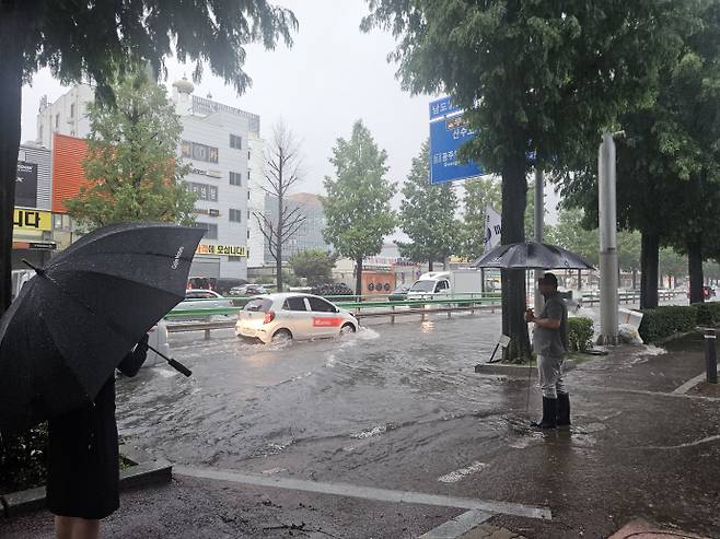 17일 오전 광주지역에 내린 기습폭우로 도로가 물바다가 되고 있다. / 이서영 기자