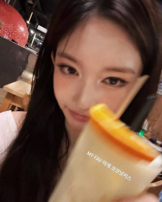 손에 아이스 음료를 들고 살짝 미소를 짓는 이서와 자연스러운 헤어스타일은 청순하면서도 귀여운 느낌을 주며, 'MY FAV 이게 코코넛키스'라는 문구와 함께 그의 순수한 매력을 더했다.
