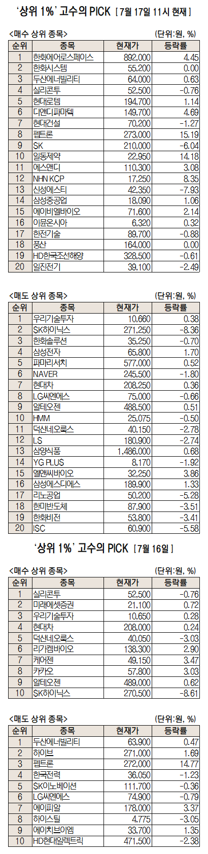 미래에셋증권은 자사 고객 중에서 지난 1개월간 수익률 상위 1% 투자자들의 매매 종목을 집계해 실시간·전일·최근 5일 기준으로 모바일트레이딩시스템(MTS) 상에서 공개하고 있다. 이 통계 데이터는 미래에셋증권의 의견과 무관한 단순 정보 안내이며 각각의 투자자 개인에게 맞는 투자 또는 수익 달성을 보장하지 않는다. 또 테마주 관련 종목은 이상 급등락 가능성이 있으므로 유의해야 한다.