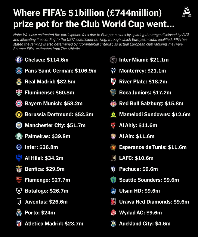 글로벌 매체 ‘디 애슬레틱’은 16일(한국 시각) FIFA 클럽 월드컵 수익 분배를 조명했다. FIFA는 개편 후 첫 대회인 이번 클럽 월드컵에 총상금 10억 달러(약 1조 3,870억 원)를 내걸었다. 총 32개 팀이 참가한 이번 대회는 치열한 경쟁 끝에 잉글랜드 프리미어리그(EPL) 구단인 첼시가 우승을 차지했다.