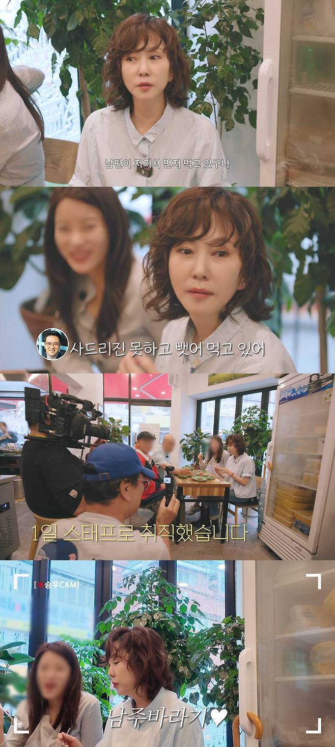 김남주는 메뉴를 기다리며 김승우를 깜짝 발견했고 "남편이 저기서 먼저 먹고 있구나. 어쩐지 익숙한 목소리가 들렸다. 사진 찍어주고 난리 났네"라며 현실 아내 면모를 보여 웃음을 안겼다.