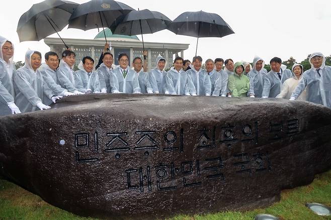 국회가 제77주년 제헌절을 맞아 17일 오전 서울 여의도 국회 잔디광장 해태상 옆에 민주주의의 상징성을 되새기기 위한 상징석을 설치했다.