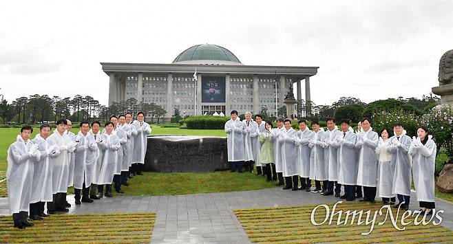| ▲ 우원식 국회의장, 주호영 부의장, 이학영 부의장, 김병기 더불어민주당 원내대표, 서왕진 조국혁신당 원내대표 천하람 개혁신당 원내대표 등 참석자들이 17일 오전 국회 잔디마당에서 열린 제77주년 제헌절 기념 상징석 제막식에서 기념촬영을 하고 있다. |