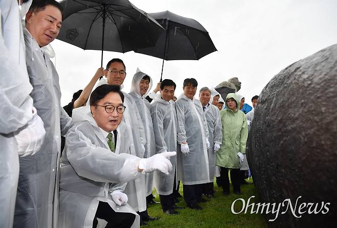 | ▲ 우원식 국회의장이 17일 오전 국회 잔디마당에서 열린 제77주년 제헌절 기념 상징석 제막식에서 상징석 글귀를 읽고 있다. |