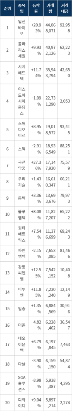 [서울데이터랩]금일 코스닥 거래량 1위 일신바이오 거래대금 929억 돌파