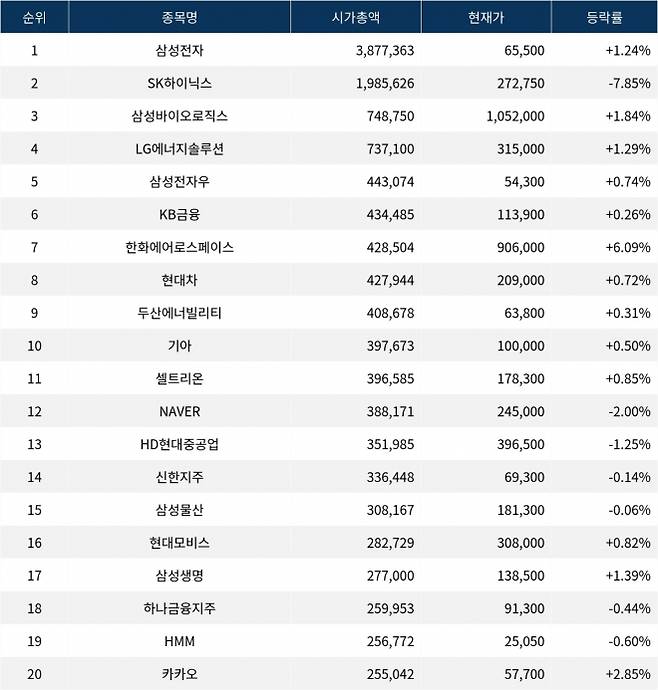 한편 시가총액 20위권 종목들은 셀트리온(068270) ▲0.85%, NAVER(035420) ▼2.00%, HD현대중공업(329180) ▼1.25%, 신한지주(055550) ▼0.14%, 삼성물산(028260) ▼0.06%, 현대모비스(012330) ▲0.82%, 삼성생명(032830) ▲1.39%, 하나금융지주(086790) ▼0.44%, HMM(011200) ▼0.60%, 카카오(035720) ▲2.85% 등의 성적을 기록하고 있다.