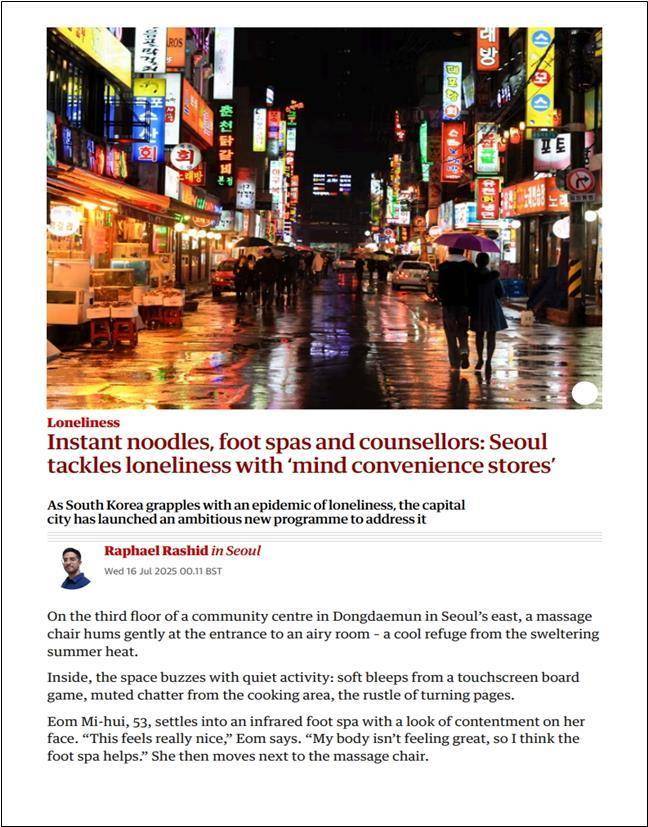 영국 일간 가디언이 서울시의 고독·외로움 해소 사업인 서울마음편의점을 조명했습니다