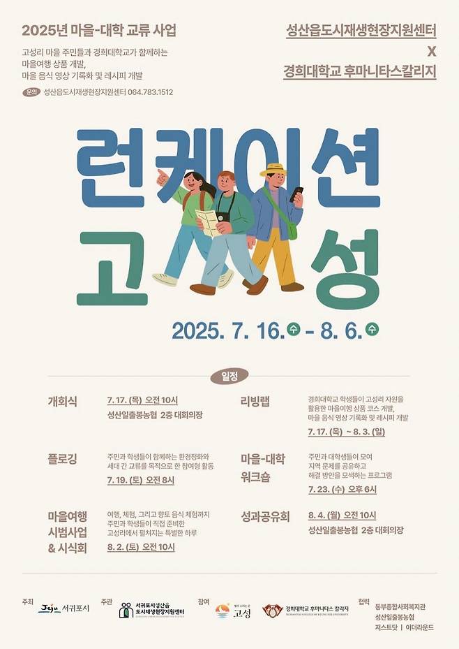 '런케이션 인 고성'은 성산읍 도시재생현장지원센터와 경희대학교 후마니타스칼리지(Humanitas College), 고성리 도시재생주민협의체가 함께 참여하는 프로그램입니다.